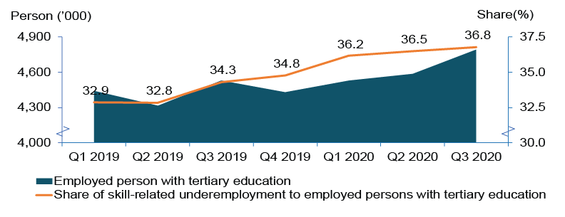 Through the LFS, skill-related underemployment is measured from the perspective of those with tertiary education and working in the semi-skilled and low-skilled occupations. Over the years, it was observed that the incidence of skill-related underemployment, had indicates the existence of some structural issue in the labour market prior to COVID-19 pandemic. This is portrayed by the quarterly average of 32.7 per cent or 1.4 million persons of skill-related underemployment during the period of Q1 2019 to Q4 2019. Incidentally, the current situation attributed to the continuous increase of skill-related underemployment to 36.8 per cent in the Q3 2020 after registering 36.5 per cent in Q2 2020. In terms of number, it increased to 1.76 million persons (Q2 2020:1.67 million persons). [Exhibit 11]