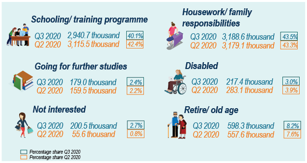 The population of outside labour force accounting for 7.32 million persons in the third quarter of 2020. The main reasons of not seeking for work among the population outside labour force was housework/family responsibilities (43.5%) and schooling (40.1%). Both groups have the potential to join the labour market if they are interested in working. [Exhibit 12]