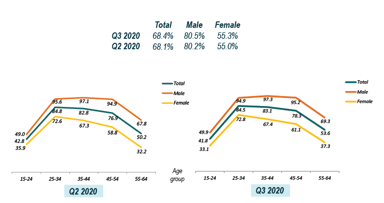 Labour force increased 1.1 per cent t o 15.84 million persons while employed persons decreased by 0.4 per cent to 15.10 million persons as compared to the third quarter of 2019. Quarter-on-quarter, labour force and employed persons inclined 1.1 per cent and 1.4 per cent respectively as against previous quarter. Labour force participation rate (LFPR) in the third quarter of 2020 rose 0.3 percentage points to 68.4 per cent from 68.1 per cent in second quarter of 2020. The employment-to-population ratio increased by 0.6 per cent to 65.2 per cent as compared to second quarter 2020. Meanwhile during this quarter outside as labour force stood at 31.6 per cent.