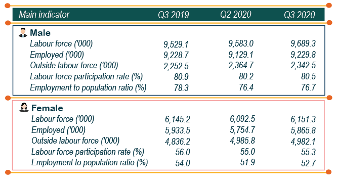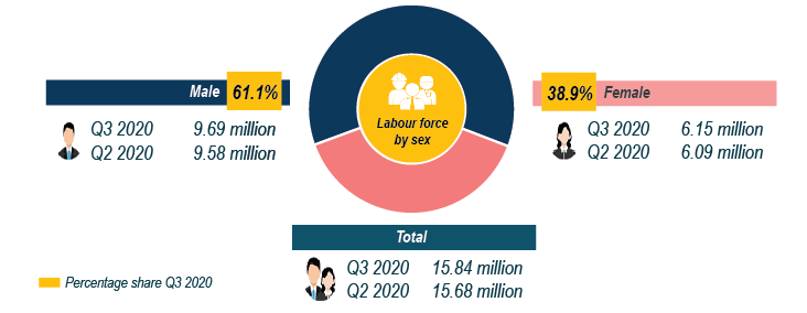 In the third quarter of 2020, the labour force comprised of male (61.2 per cent or 9.69 million persons) and 38.8 per cent or 6.15 million persons for female. The number of labour force for male and female increased by 106.3 thousand persons and 58.8 thousand persons respectively as compared to the second quarter of 2020. [Exhibit 5]