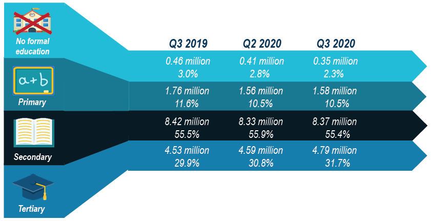 Employed person with secondary education attainment dropped 0.5 percentage points to 8.37 million persons while the number of employed persons with tertiary education rose 0.9 percentage points to 4.79 million persons (Q2 2020: 4.59 million persons). [Exhibit 6]