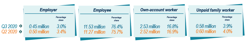 In the third quarter of 2020, employees category contributed 11.53 million persons or 76.4 per cent of total employed person. Meanwhile, the percentage share of own-account worker decreased 0.1 percentage point. However, the number of own account worker increased from 2.52 million persons to 2.53 million persons as compared to previous quarter. [Exhibit 7]
