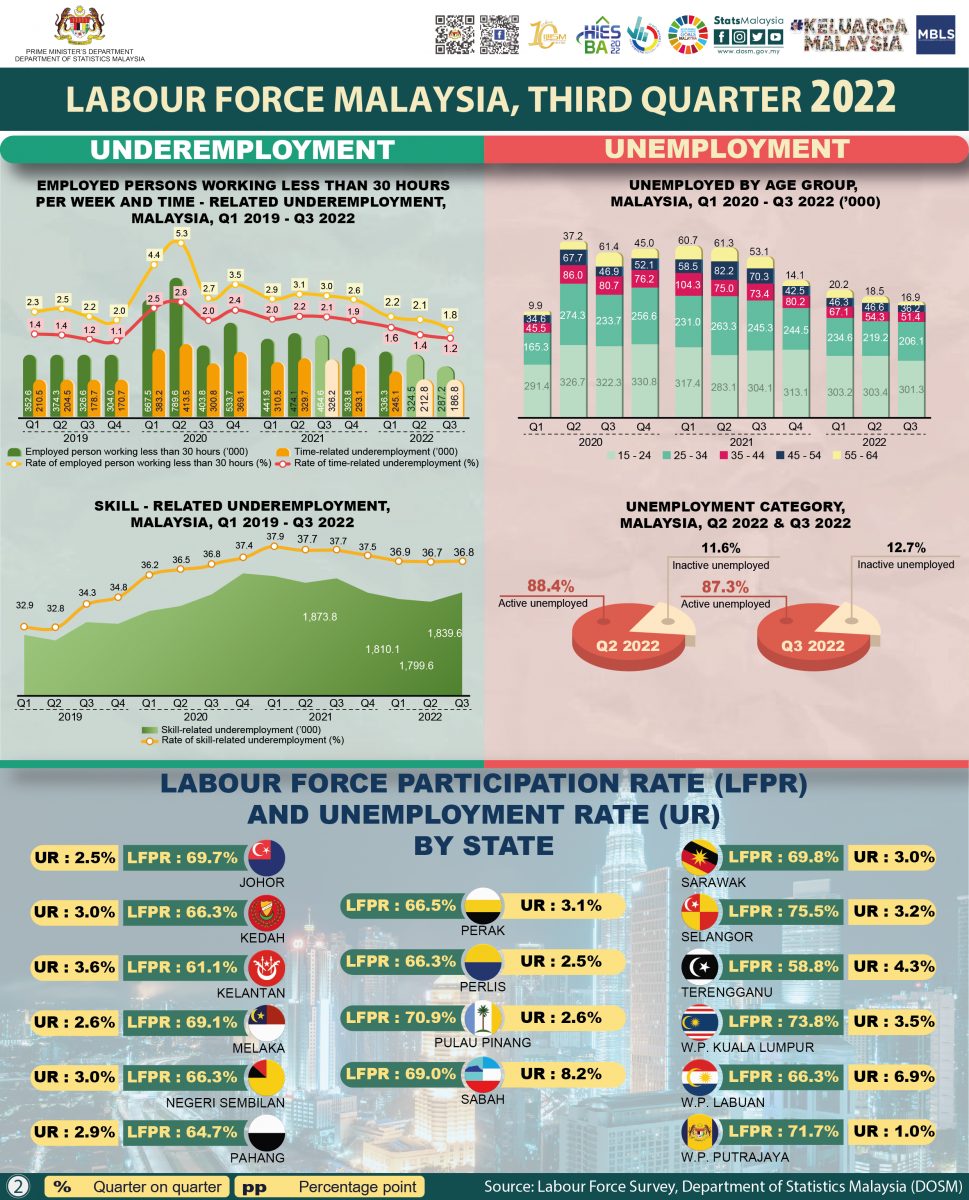 The full publication of the Labour Force Survey Report, Malaysia, Third Quarter 2022 can be downloaded through eStatistik Portal.