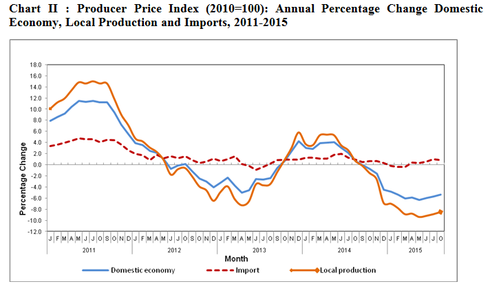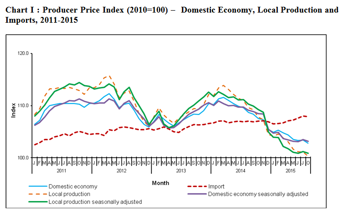 Year-on-year comparison showed that the PPI for domestic economy in August 2015 decreased by 5.4 per cent with local production index dropped by 8.5 per cent while the import price index inclined by 0.8 per cent. (Table I)