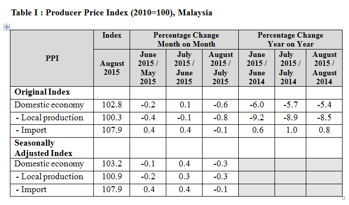 Producer Price Index Malaysia August 2015