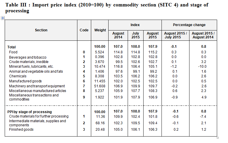 On a monthly basis, the import price index by stage of processing (SOP) for August 2015 decreased by 0.1 per cent compared to the previous month. This was due to decreases of 0.6 per cent in the index for Crude materials for further processing and 0.1 per cent in Intermediate materials supplies and components, while index for Finished goods recorded an increase by 0.2 per cent.
