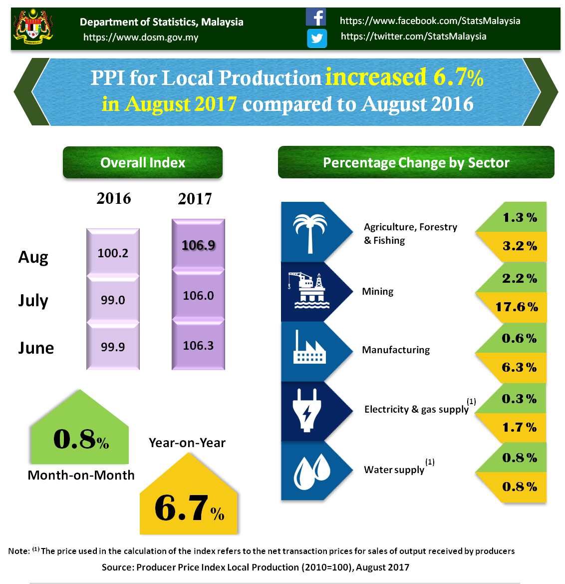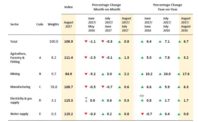 The Producer Price Index (PPI) for local production rose 6.7 per cent on a year -on- year basis in August 2017, 0.4 point lower compared to 7.1 percent in July 2017. Among the sectors which showed significant increases during this period were Mining (+17.6%), Manufacturing (+6.3%), Agriculture, forestry & fishing (+3.2%), Electricity & gas supply (+1.7%) and Water supply (+0.8%).