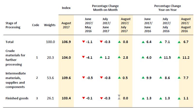 The PPI for local production by stage of processing (SOP) rose by 0.8 per cent in August 2017, after declining 0.3 per cent in preceding month. This incline was due to increases in the indices for Crude materials for further processing (+2.8%), intermediate materials, supplies and components (+0.5%) and Finished goods remains unchanged.