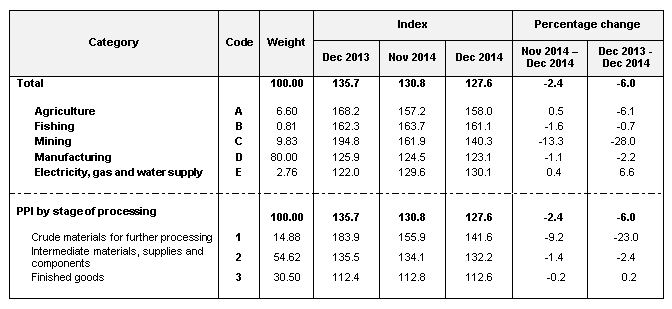 As compared with the same month a year ago, the PPI for local production by SOP for December 2014 also decreased by 6.0 per cent. Crude materials for further processing dropped 23.0 per cent followed by index for Intermediate materials, supplies and components 2.4 per cent. However, Finished goods went up by 0.2 per cent.