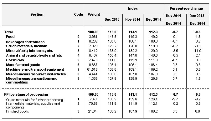 The PPI for domestic economy in December 2014 decreased by 1.9 per cent with the both PPI for local production and import price index were moved down by 2.4 and 0.7 per cent respectively. (Table 1).