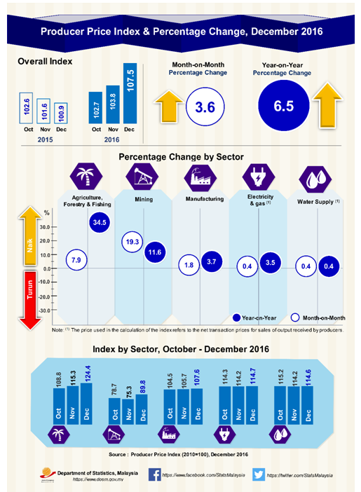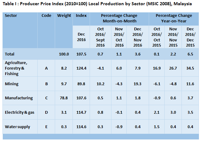 Year-on-year comparison showed that the Producer Price Index (PPI) for local production surged 6.5 per cent in December 2016. The highest increase was recorded by Agriculture, forestry & fishing index (+34.5%) followed by Mining (+11.6%), Manufacturing (+3.7%), Electricity & gas (+3.5%) and Water supply (+0.4%).[Table I]