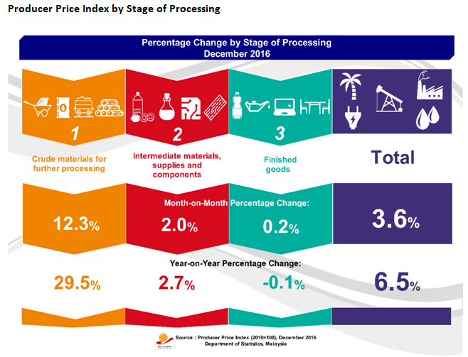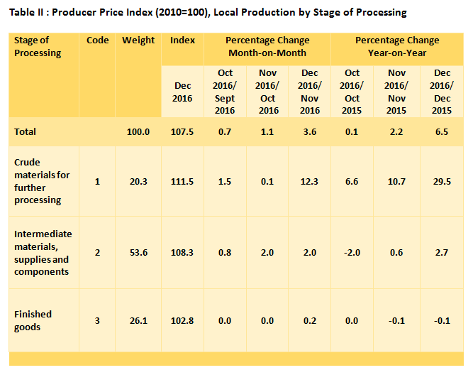 As compared with the same month a year ago, the PPI for local production by SOP for December 2016 increased by 6.5 per cent. This was due to an increase in index for Crude materials for further processing (+29.5%) and Intermediate materials, supplies and components (+2.7%). However, the index for Finished goods dropped by 0.1 per cent.