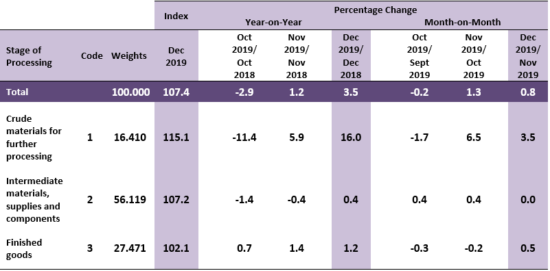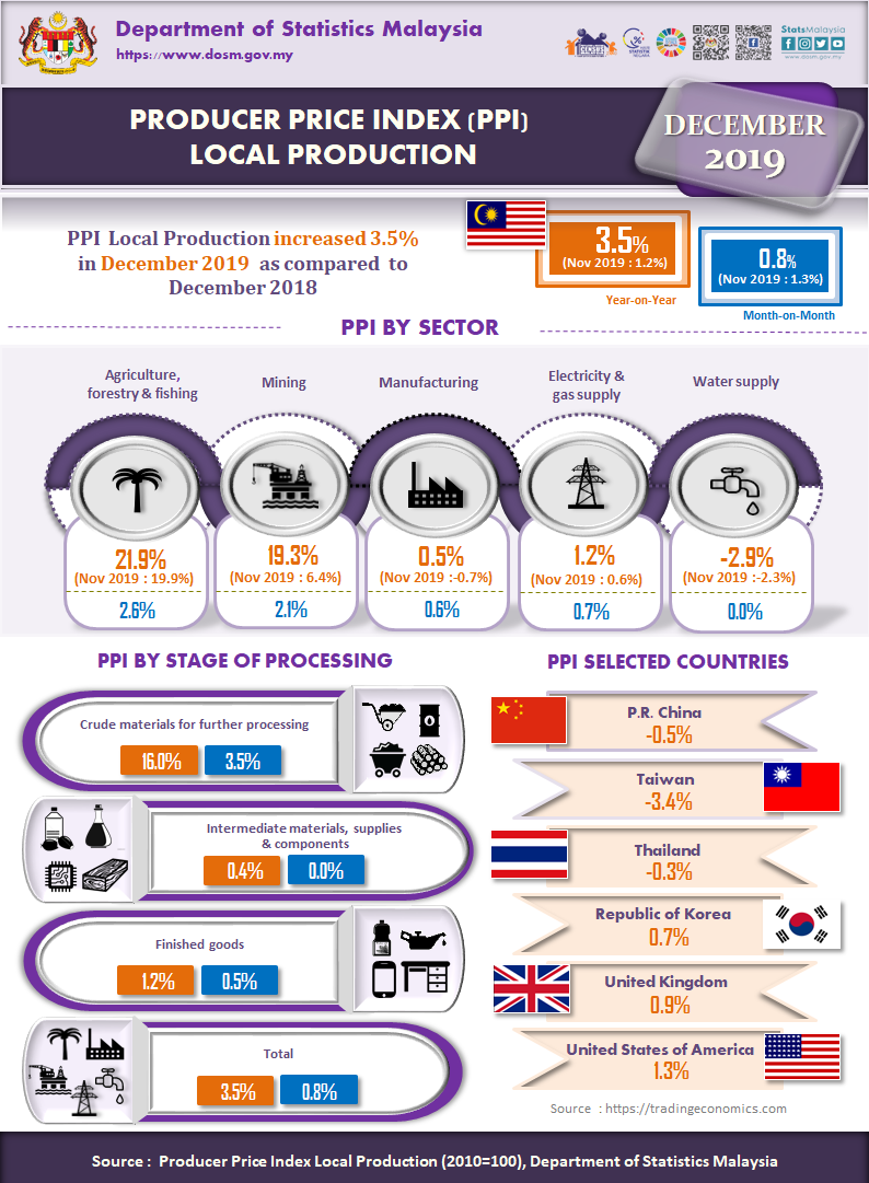 In December 2019, the PPI local production by stage of processing (SOP) increased 3.5 per cent as compared to December 2018. It was contributed by Crude materials for further processing (16.0%), Finished goods (1.2%) and Intermediate materials, supplies & components (0.4%) indices.