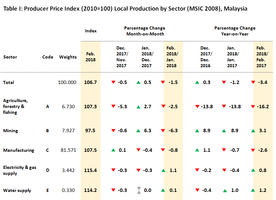 On a monthly basis, PPI for local production decreased by 1.5 per cent in February 2018. This was due to decrease in Mining (-6.3%), Agriculture, forestry & fishing (-2.5%) and Manufacturing (-0.8%) sectors. Meanwhile, the index for the Electricity & gas supply and water supply sectors increased by 1.1 per cent and 0.1 per cent respectively. [Table I].