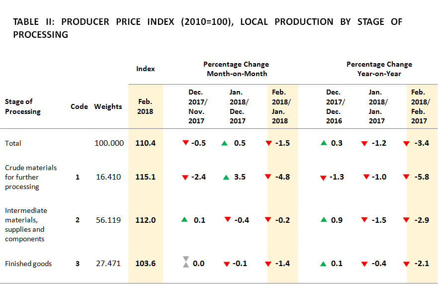 As compared with the same month a year ago, the PPI for local production by SOP for February 2018 decreased 3.4 per cent. The decreased was fuelled by the index for Crude materials for further processing (-5.8%), Intermediate materials, supplies and components (-2.9%) and Finished goods (-2.1%). [Table II].