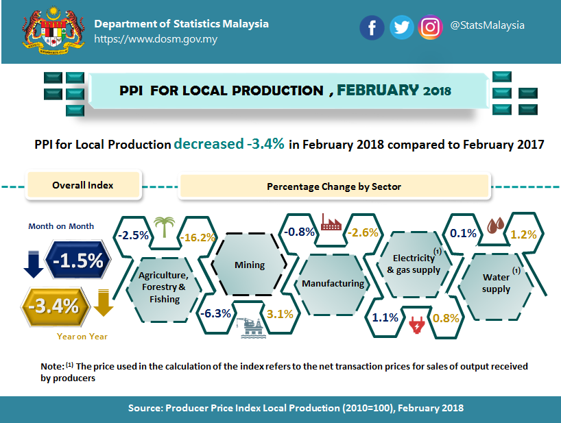The Producer Price Index (PPI) for local production decreased 3.4 per cent on a year -on- year basis in February 2018 compared to a decrease of 1.2 per cent in January 2018. Among the sectors which decreased during this period were Agriculture, forestry & fishing (-16.2%), and Manufacturing (-2.6%). Meanwhile, the index registered increases for mining (+3.1%), Water supply (+1.2%) and Electricity & gas supply (+0.8%) sectors.