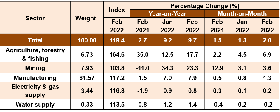 In terms of month-on-month comparison, the PPI local production increased 2.0 per cent as opposed to 1.3 per cent recorded in the previous month. The increase was driven by a 6.9 per cent increase in Agriculture, forestry & fishing index (January 2022: 4.5%), where it was underpinned by higher price of Oil palm fresh fruit bunches. Meanwhile, prices of Crude oil and Natural gas continued to rise in February 2022, which led to a 3.6 per cent increase in Mining index. Manufacturing index also increased 1.3 per cent (January 2022: 0.8%), contributed by the indices of subsectors Manufacture of vegetable & animal oils & fats (3.2%), Manufacture of refined petroleum products (2.1%) and Manufacture of electronic components & boards (0.5%). In addition, Electricity & gas supply index edged up 0.2 per cent, while, Water supply index declined 0.2 per cent.