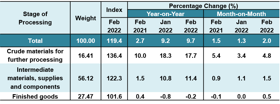 The index of Crude materials for further processing increased 17.7 per cent in February 2022, supported by the indices of Non-food materials and Foodstuffs & feedstuffs which increased by 20.4 per cent and 3.7 per cent respectively. Similarly, the index of Intermediate materials, supplies & components continued to register a double-digit increase of 11.4 per cent in February 2022 (January 2022: 10.8%) driven by an increase in the indices of Processed fuel & lubricants (18.4%) and Materials & components for manufacturing (11.8%). However, Finished goods index decreased 0.2 per cent due to a decrease in the index of Capital equipment (-1.8%).