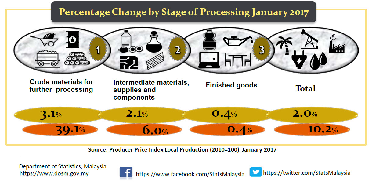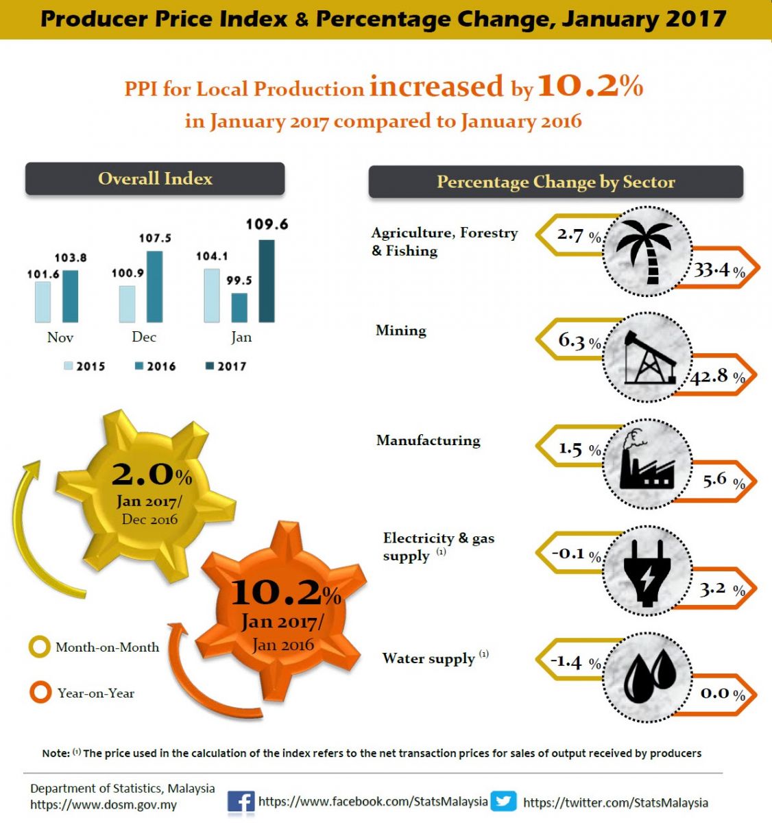 As compared with the same month a year ago, the PPI for local production by SOP for January 2017 increased by 10.2 per cent. This was due to increases in index for Crude materials for further processing (+39.1%), Intermediate materials, supplies and components (+6.0%) and Finished goods (+0.4%).