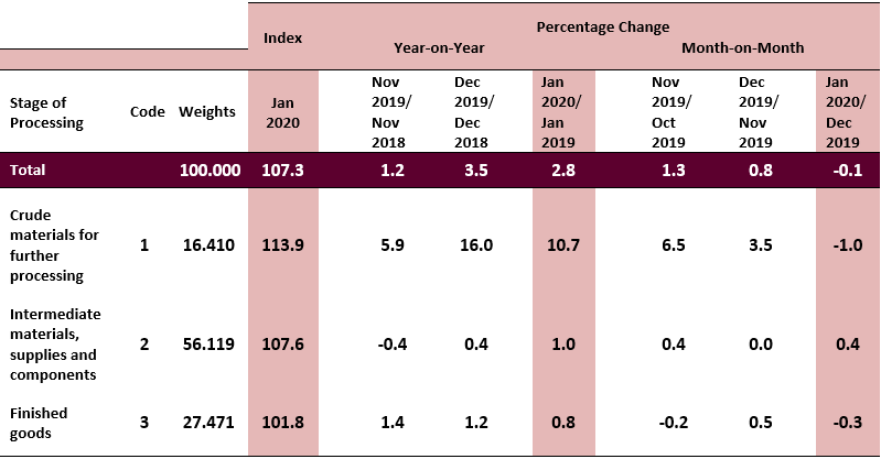 As compared with the same month a year ago, the PPI for local production by stage of processing (SOP) for January 2020 increased 2.8 per cent. The increase were for all stages of processing that is Crude materials for further processing (10.7%), Intermediate materials, supplies & components (1.0%) and Finished goods (0.8%).