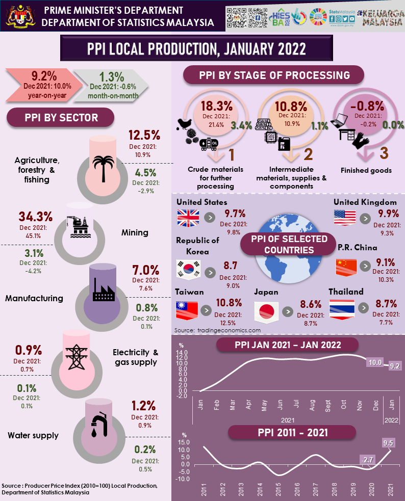 The Producer Price Index (PPI) local production which measures the costs of goods at factory gate increased 9.2 per cent in January 2022 as compared to a decrease of 0.1 per cent recorded in January 2021. The increase was lower than a 10.0 per cent year-on-year incline registered in December last year. The increase in the PPI local production in January 2022 was supported by Mining index that rose 34.3 per cent from a decline of 28.3 per cent recorded in January last year. The prices of Crude oil and Natural gas that registered an increase of 33.5 per cent and 39.0 per cent respectively contributed to the increase. The index of Agriculture, forestry & fishing increased moderately at 12.5 per cent as opposed to an increase of 22.6 per cent recorded in January 2021. The increase was due to the incline in the indices of Growing of perennial crops (14.6%) and Fishing (13.3%). Manufacturing index also registered an increase of 7.0 per cent (January 2021: 1.1%), largely due to the increase in the indices of subsectors namely Manufacture of refined petroleum products (19.2%), Manufacture of vegetable & animal oils & fats (17.0%) and Manufacture of electronic components & boards (0.4%). In addition, the indices of other subsectors such as Manufacture of basic chemicals, fertilizers & nitrogen compounds, plastics & synthetic rubber in primary forms, Manufacture of basic iron & steel and Manufacture of plastics products also inclined. Similarly, the indices of Water supply and Electricity & gas supply increased 1.2 per cent and 0.9 per cent respectively.