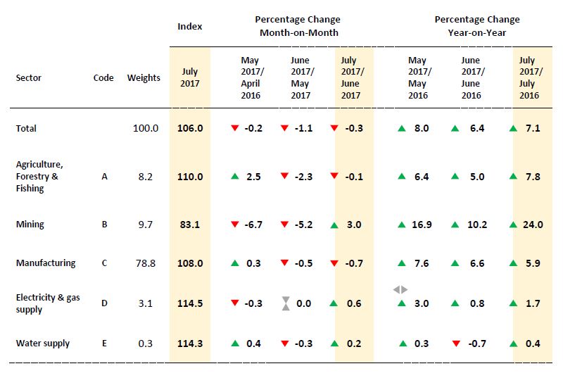 The Producer Price Index (PPI) for local production rose 7.1 per cent on a year on year basis in July 2017. Among the sectors which showed significant increases during this period were Mining (+24.0%), Agriculture, forestry & fishing (+7.8%), Manufacturing (+5.9%), Electricity & gas supply (+1.7%) and Water supply (+0.4%).