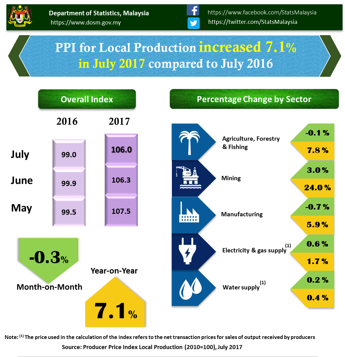 On a monthly basis, PPI for local production declined by 0.3 per cent in July 2017 compared to June 2017. This was due to decreases in two sectors namely, Manufacturing (-0.7%) and Agriculture, forestry & fishing (-0.1%). However, sectors for Mining, Electricity & gas supply and Water supply increased by (+3.0%), (+0.6%) and (+0.2%) respectively. [Table I]