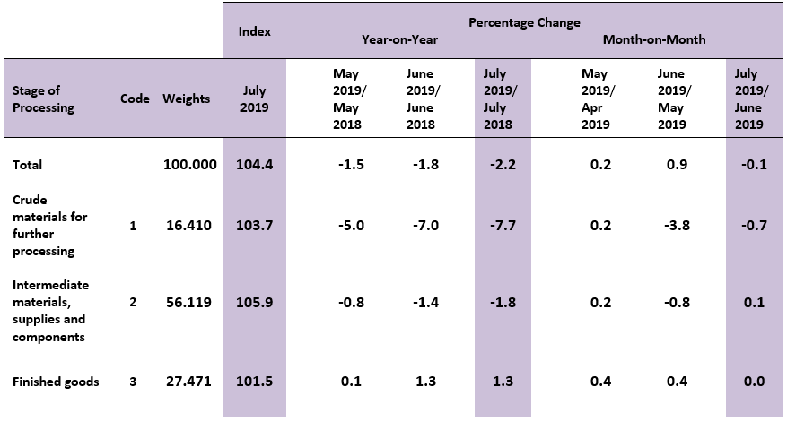 In July 2019, the PPI local production by stage of processing (SOP) declined 2.2 per cent. The decrease was attributed by Crude materials for further processing (-7.7%) and Intermediate materials, supplies & components (-1.8%) indices. Conversely, the index of Finished goods rose 1.3 per cent.