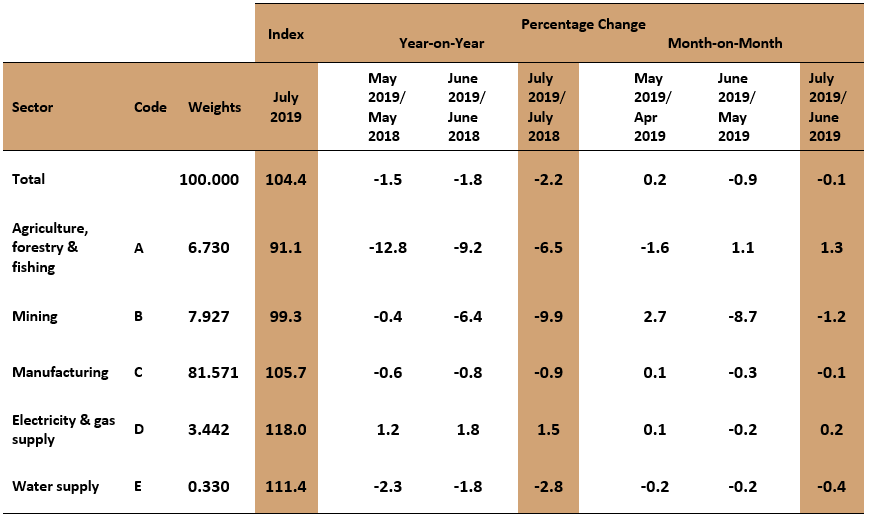 As compared to the previous month, the PPI local production declined 0.1 per cent in July 2019. The index of Mining registered the highest rate of decline at 1.2 per cent, followed by Water supply (-0.4%) and Manufacturing (-0.1%) indices. In contrast, Agriculture, forestry & fishing and Electricity & gas supply indices increased 1.3 per cent and 0.2 per cent respectively. The PPI local production for the period of January to July 2019 registered a decrease of 2.0 per cent as compared to the same period last year.