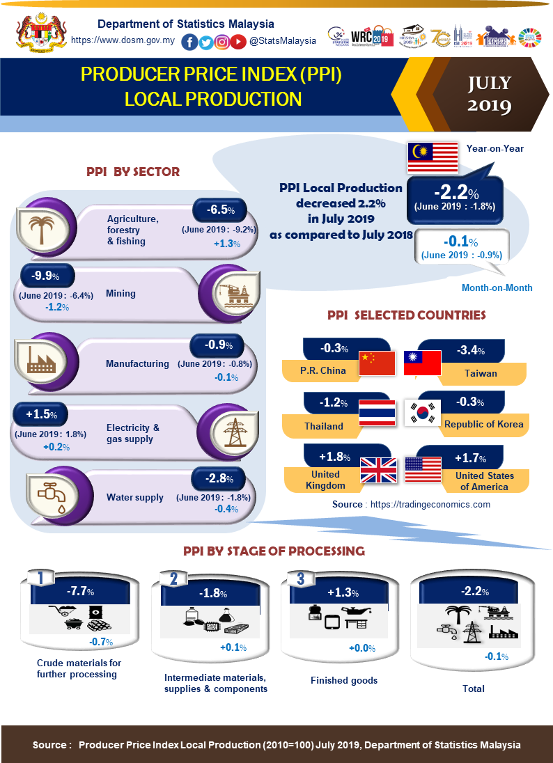 On a monthly basis, the PPI local production by SOP for July 2019 decreased 0.1 per cent. This was due to the index of Crude materials for further processing (-0.7%). On the other hand, the index of Intermediate materials, supplies & components increased 0.1 per cent while the Finished goods index was unchanged.