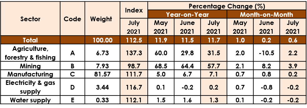 The Producer Price Index (PPI) local production edged up to 11.7 per cent year-on-year in July 2021 from 11.5 per cent recorded in June 2021. The Mining index rose 57.7 per cent due to higher prices of natural gas and continuous increase in prices of crude oil commodity. The Agriculture, forestry and fishing index recorded double digit growth of 31.5 per cent (June 2021: 29.8%) attributed by the increase in prices of fresh fruit bunches and other commodities. In addition, the increase in Manufacturing index was contributed by higher prices of primary commodities and construction-related commodities (7.1%). In terms of utility indices, Water supply and Electricity & gas supply each rose 1.3 per cent and 0.2 per cent.