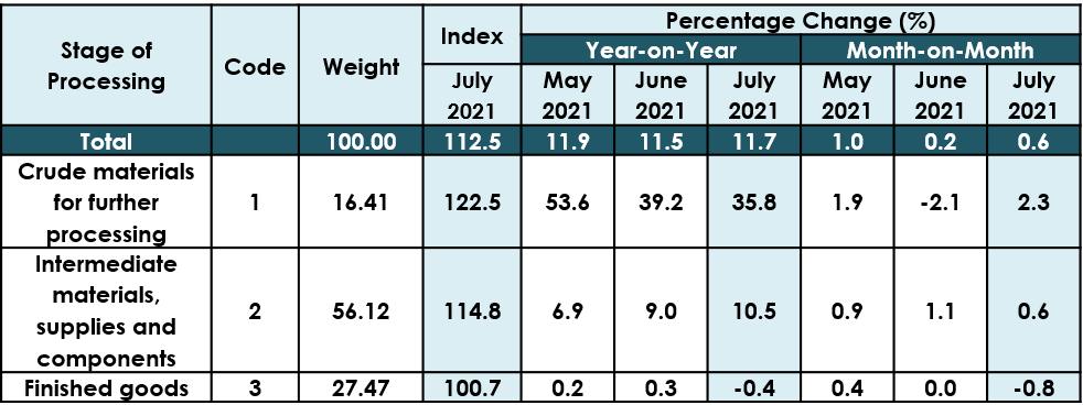 In July 2021, the index of Crude materials for further processing increased 35.8 per cent as opposed to 39.2 per cent recorded in the previous month. Similarly, the index of Intermediate materials, supplies & components also increased 10.5 per cent. However, the index of Finished goods registered a decrease of 0.4 per cent.