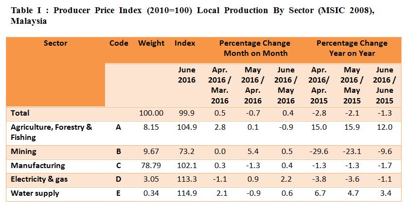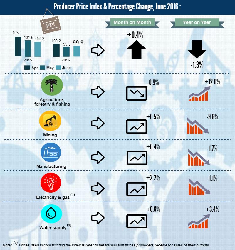 As compared with the same month a year ago, the PPI for local production by SOP for June 2016 dropped by 1.3 per cent. This was due to decreases in index for Intermediate materials, supplies and components (-2.7%). However, index for Finished goods increased by 0.7 per cent followed by index for Crude materials for further processing (+0.2%).