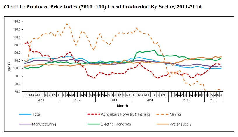 Year-on-year comparison showed that the PPI for local production fell 1.3 per cent in June 2016. The highest drop was recorded by Mining index (-9.6%), followed by Manufacturing (-1.7%) and Electricity & gas (-1.1%). Meanwhile, the index for Agriculture, forestry & fishing and Water supply showed an increase of 12.0 per cent and 3.4 per cent respectively. [Table I].