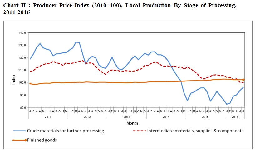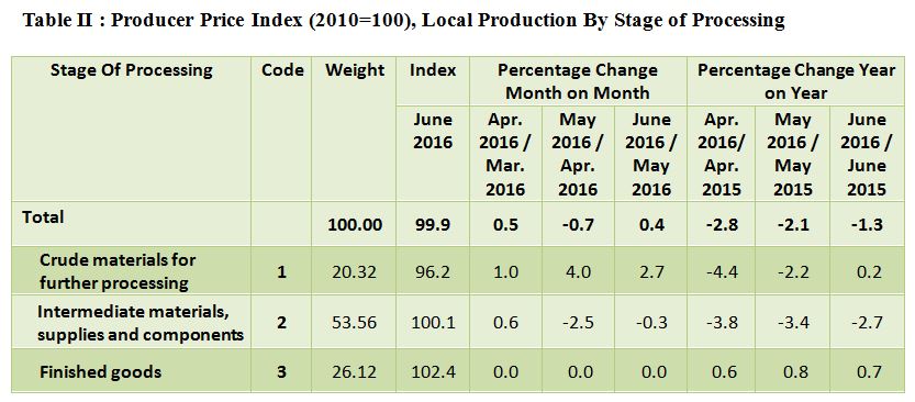The PPI for local production by stage of processing (SOP) inclined by 0.4 per cent in June 2016 compared to the previous month. This inclination was due to an increase in Crude materials for further processing (+2.7%). Meanwhile, Intermediate materials, supplies and components decreased by - 0.3%, however, Finished goods remained unchanged. [Table II]