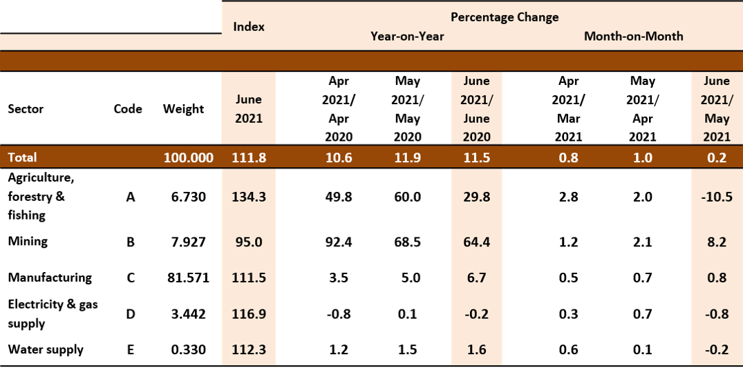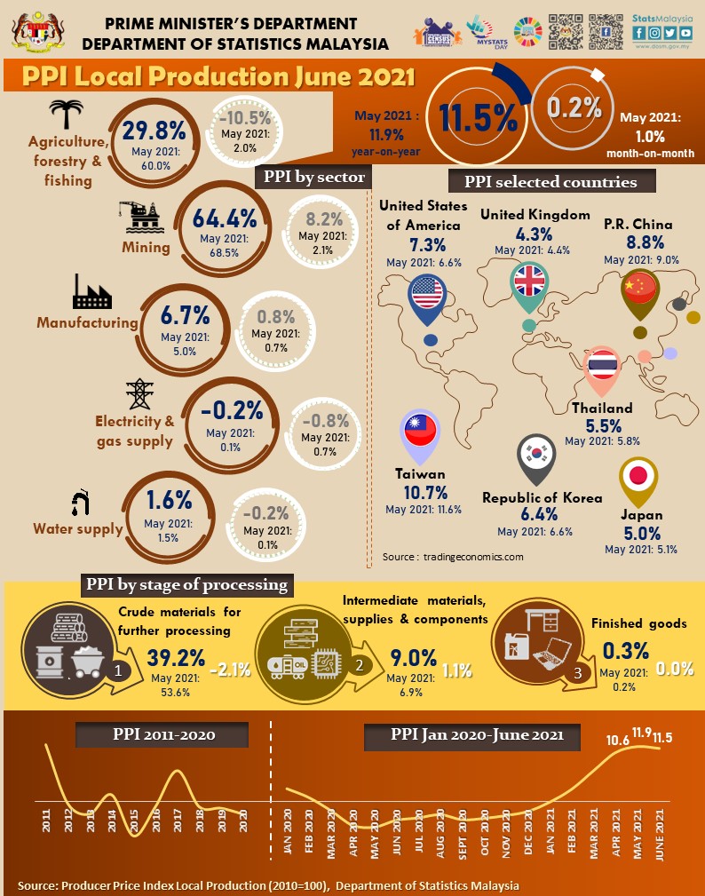 On a monthly basis, the PPI local production registered a marginal increase of 0.2 per cent in June 2021 as compared to 1.0 per cent in the previous month. The increase was supported by the index of Mining (8.2%) and Manufacturing (0.8%). Meanwhile, Agriculture, forestry & fishing, Electricity & gas supply and Water supply indices recorded a decline of 10.5 per cent, 0.8 per cent and 0.2 per cent respectively.