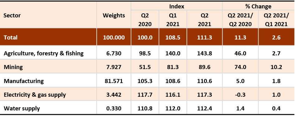 The PPI local production for the second quarter of 2021 rose 11.3 per cent to 111.3 from 100.0 in the same quarter of the previous year. The increase was contributed by the index of Mining (74.0%), Agriculture, forestry & fishing (46.0%), Manufacturing (5.0%) and Water supply (1.4%). Meanwhile, Electricity & gas supply recorded a decline of 0.3 per cent. On a quarterly basis, the PPI local production rose 2.6 per cent as compared to 5.1 per cent in the first quarter of 2021.