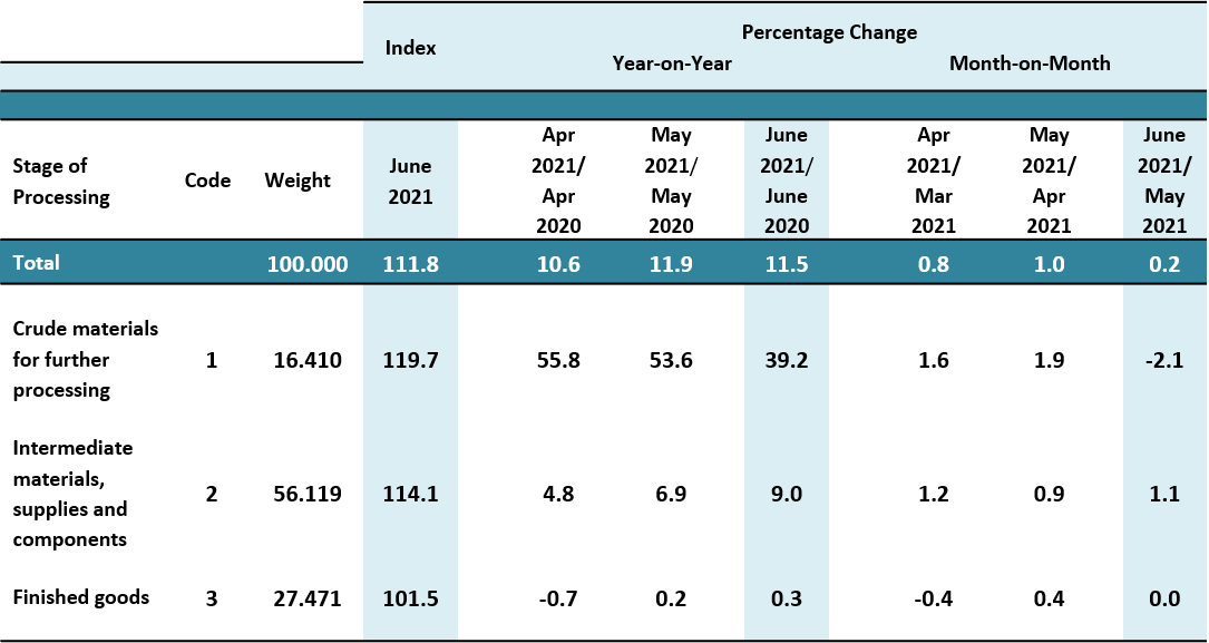 In June 2021, all stages of processing recorded an increase in price. The index of Crude materials for further processing increased 39.2 per cent as compared to 53.6 per cent recorded in the previous month. The index of Intermediate materials, supplies & components also increased 9.0 per cent. Similarly, the Finished goods index edged up 0.3 per cent.