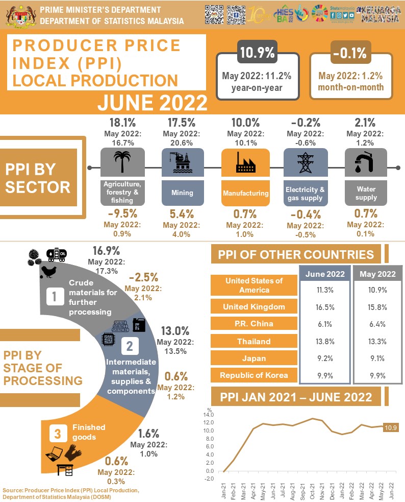 The full publication of the Producer Price Index Malaysia, June 2022 can be downloaded from eStatistik portal.