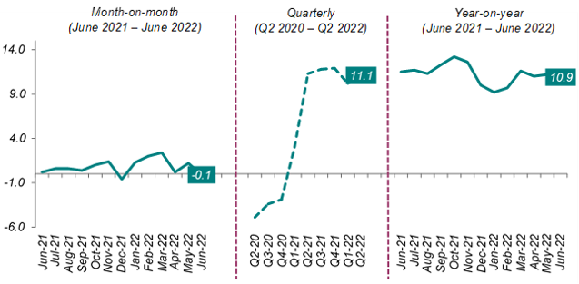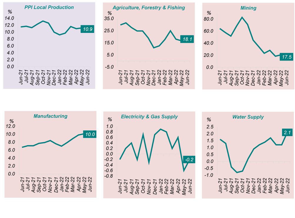 The increase in Malaysia’s Producer Price Index which measures the prices of goods at factory gate eased to record 10.9 per cent in June 2022 as compared to 11.2 per cent recorded in May 2022. All sectors recorded a double digit increase except for utility sectors. Manufacturing sector which is the highest weight in the PPI (81.6%), posted a 10.0 per cent increase in June 2022. Although the sub-sectors from this sector recorded a two-digit increase, the magnitude of increase has slowed down. Manufacture of coke & refined petroleum products recorded 22.3 per cent in June 2022, down from 22.9 per cent in May 2022. Similarly, Manufacture of food products posted a slower increase to 18.6 per cent in June 2022 from 19.3 per cent recorded in the previous month. Manufacture of chemicals & chemical products also eased from 11.4 per cent in May 2022 to 10.5 per cent in June 2022. In addition, 16 other sub-sectors posted a lower increase in the range of between 0.4 per cent and 9.5 per cent. On the other hand, two sub-sectors recorded a decline and one sub-sector remained unchanged.