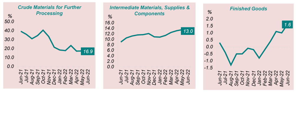 The index of Crude materials for further processing increased at a slower rate of 16.9 per cent in June 2022 in comparison to 17.3 per cent recorded in May 2022. The increase was contributed by indices of Non-food materials (19.2%) and Foodstuffs & feedstuffs (4.8%). Similarly, index of Intermediate materials, supplies & components increased 13.0 per cent in June 2022, slightly lower than 13.5 per cent recorded in May 2022. The increase was driven by an increase in indices of Processed fuel & lubricants (18.0%), Materials & components for manufacturing (14.1%) and Supplies (6.3%). On the other hand, Finished goods index registered a higher increase in June 2022 with 1.6 per cent (May 2022: 1.0%), attributed by the increase in Finished consumer foods (6.7%) index.