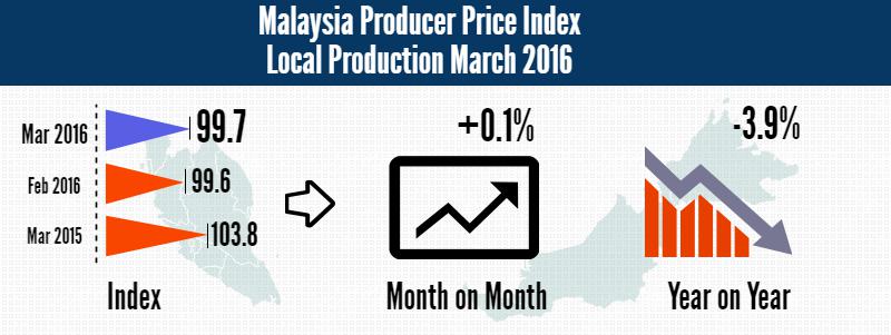 As compared with the same month a year ago, the PPI for local production by SOP for March 2016 dropped by 3.9 per cent. This was due to decreases in index for Crude materials for further processing (-3.5%), followed by index for Intermediate materials, supplies and components (-6.2%). However, index for Finished goods increased by 0.7 per cent.