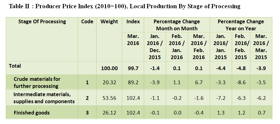 The PPI for local production by stage of processing (SOP) inclined by 0.1 per cent in March 2016 compared to the previous month. This inclination was due to an increase in Crude materials for further processing (+6.7%). However, Intermediate materials, supplies and components and Finished goods declined by 1.6 per cent and 0.4 per cent respectively. [Table II]