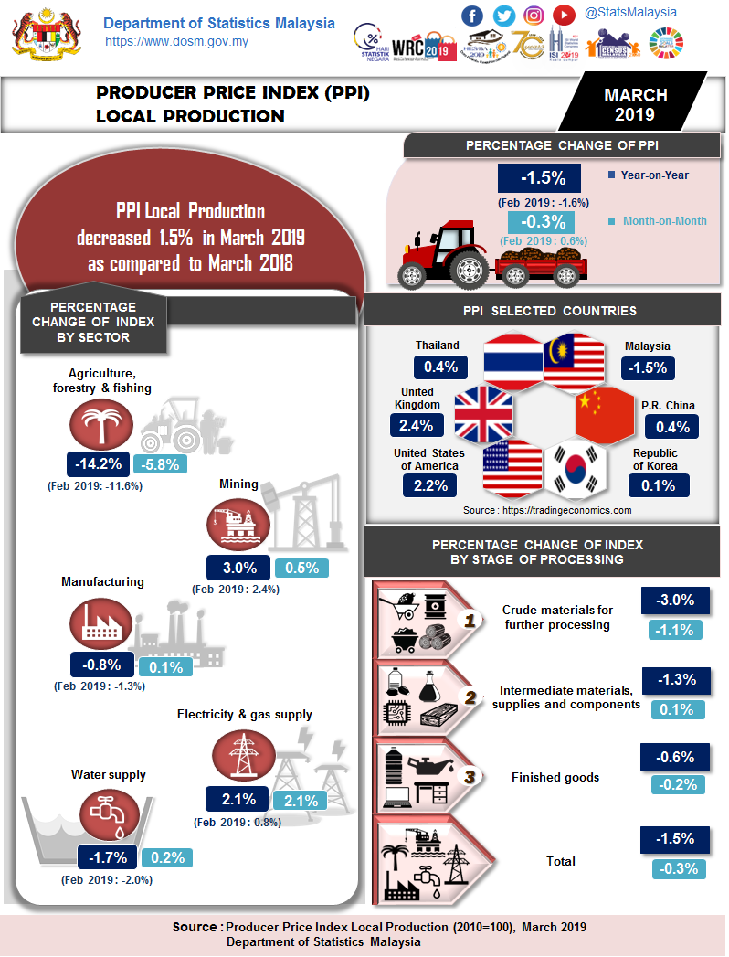 On monthly basis, the PPI local production by SOP for March 2019 decreased 0.3 per cent which was contributed by Crude materials for further processing (-1.1%) and Finished goods (-0.2%). On the other hand, Intermediate materials, supplies & components rose 0.1 per cent.