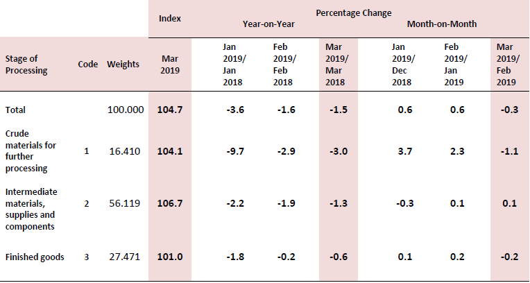 In March 2019, the PPI local production at all stage of processing (SOP) showed a decline as compared to the same month last year. It was contributed by the index of Crude materials for further processing (-3.0%), Intermediate materials, supplies and components (-1.3%) and Finished goods (-0.6%).