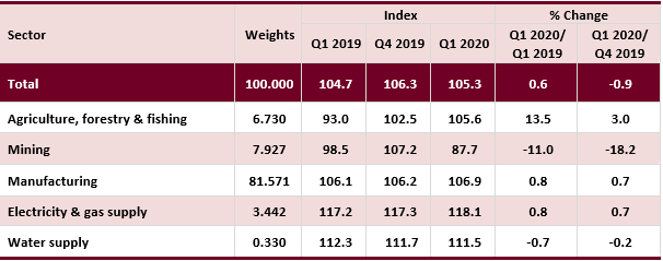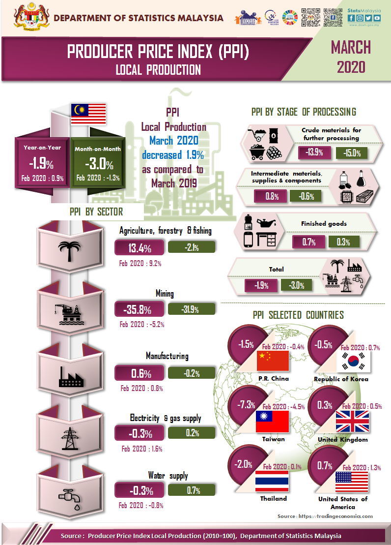 PPI local production for the first quarter 2020 increased 0.6 per cent to 105.3 as compared to 104.7 in the same quarter of the previous year. The increase was contributed by Agriculture, forestry & fishing (13.5%), Manufacturing (0.8%) and Electricity & gas supply (0.8%). Meanwhile, the index of Mining and Water supply recorded a decrease of 11.0 per cent and -0.7 per cent. On a quarterly basis, the PPI local production fell 0.9 per cent as compared to the fourth quarter 2019. [Table 2]