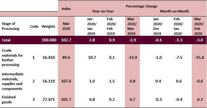 As compared with the same month a year ago, the PPI for local production by stage of processing (SOP) for March 2020 declined 1.9 per cent. The decrease was attributed by the Crude materials for further processing at 13.9 per cent. However, the index of Intermediate materials, supplies & components and Finished goods increased 0.8 per cent and 0.7 per cent respectively.