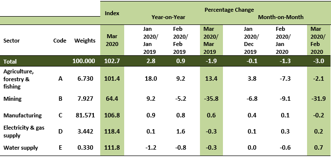 The Producer Price Index (PPI) local production decreased 1.9 per cent in March 2020 to 102.7 as against 104.7 in the same month of the previous year. The Mining index registered the highest rate of decline at 35.8 per cent, followed by Electricity & gas supply (-0.3%) and Water supply (-0.3%). In contrast, the index of Agriculture, forestry & fishing surged by 13.4 per cent and Manufacturing index increased by 0.6 per cent.