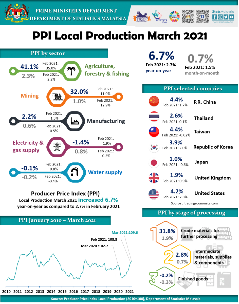 On a monthly basis, the PPI local production recorded an increase of 0.7 per cent in March 2021, down from 1.5 per cent in February 2021. All four indices continued its momentum of growth; Agriculture, forestry & fishing (2.3%), Mining (1.0%), Manufacturing (0.6%) and Electricity & gas supply (0.8%). Meanwhile, the Water supply index fell 0.2 per cent.