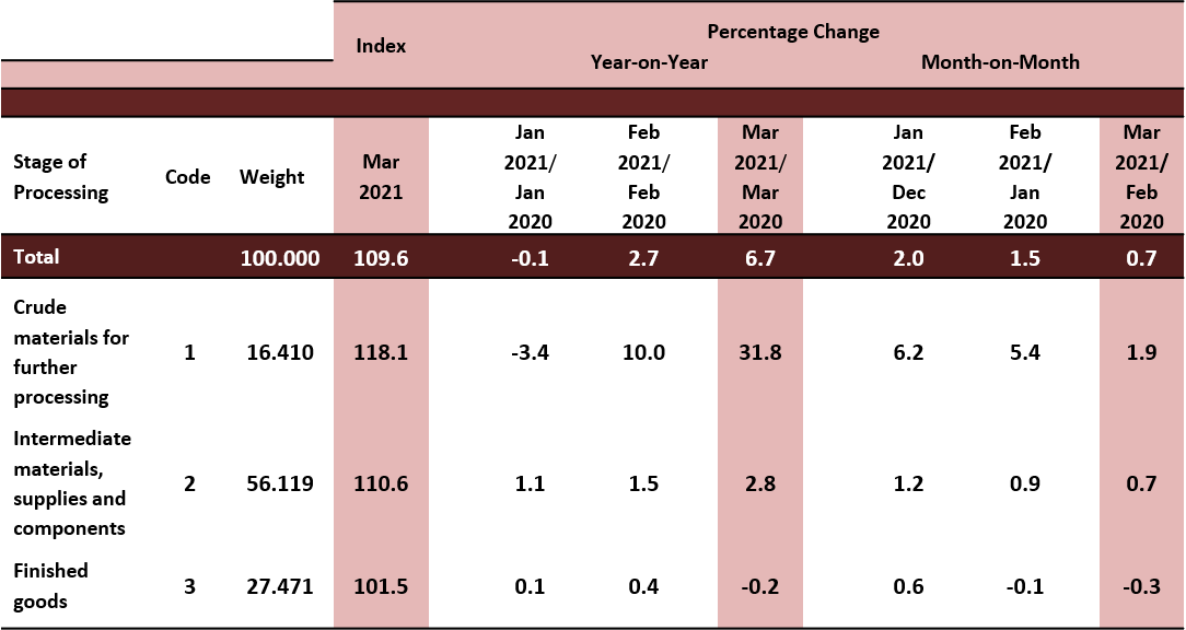 Month on Month, the Crude materials for further processing index increased by 1.9 per cent from 5.4 per cent in the previous month. The Intermediate materials, supplies & components index also recorded an increase of 0.7 per cent (February 2021: 0.9%). However, the index of Finished goods decreased 0.3 per cent.
